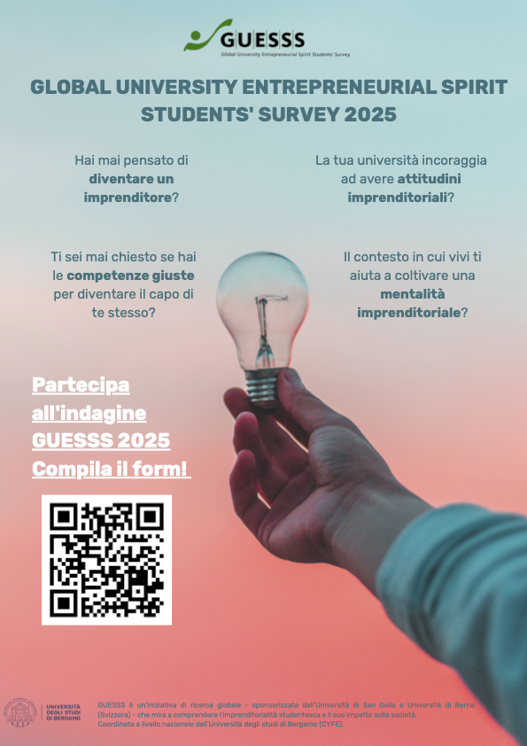 Partecipando al nostro sondaggio online, aiuterete l'Università di Bergamo, anche tramite il confronto internazionale, a capire come la formazione, specialmente quella imprenditoriale, aiuti a definire le vostre scelte di carriera.
